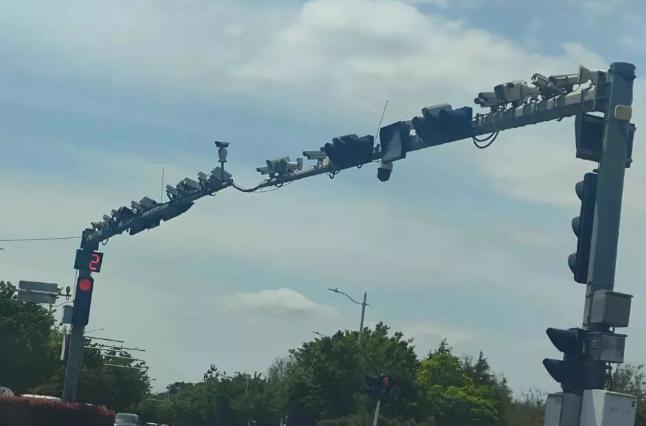 網友曬出的圖片顯示,路口針對來往兩個方向的兩根橫杆上,至少安裝了十多個監控探頭。該網友還表示,「以前這個路口的探頭也不少,但沒有現在這麼多。」
