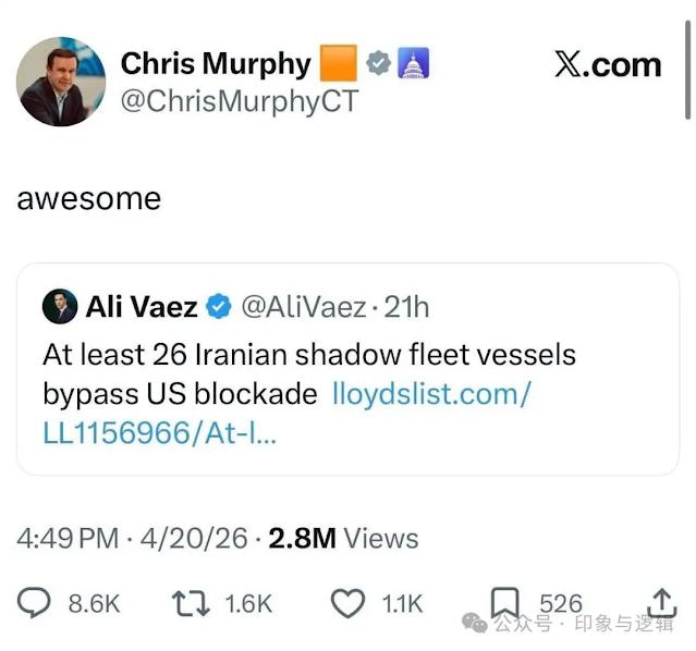 當時一篇報道宣稱,至少26艘伊朗影子艦隊船隻繞過美國在阿曼灣、霍爾木茲海峽的封鎖,試圖突破美軍海上防線。墨菲看到後,竟然只甩出一個單詞「太棒了」(Awesome)。