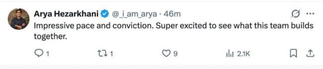 電磁超級智能企業Arena Physica CTO Arya Hezarkhani評論稱:「令人驚嘆的速度和信念。非常期待看到這個團隊共同努力的成果。」
