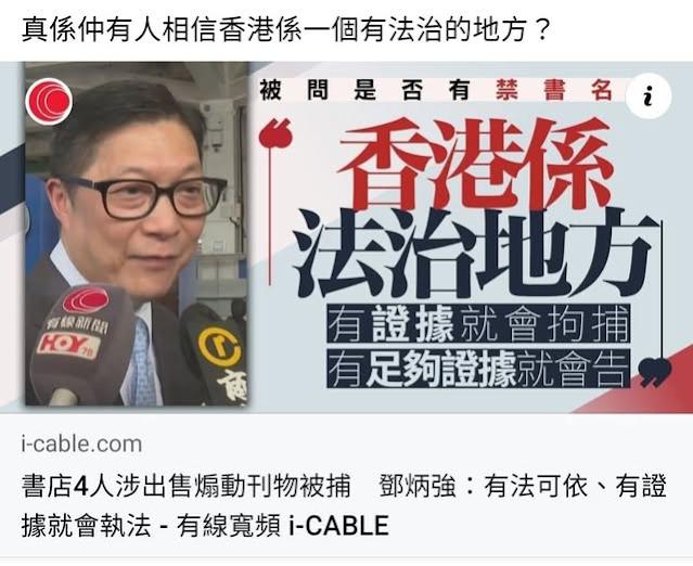 這張圖片展示了香港保安局局長鄧炳強在回應有關「禁書」與書店人員被捕事件時的言論。他強調「香港是法治地方」,並表示執法行動是基於證據。