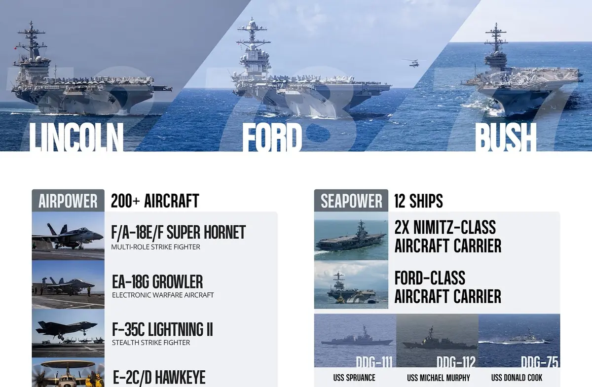 美軍三艘航母部署在中東,是伊拉克和阿富汗戰爭以來的首次,顯示美國準備制服伊朗的決心。這三艘航母也可以在數日內抵達西太平洋,與常駐日本的「華盛頓號」航母匯聚,完成四航母部署。