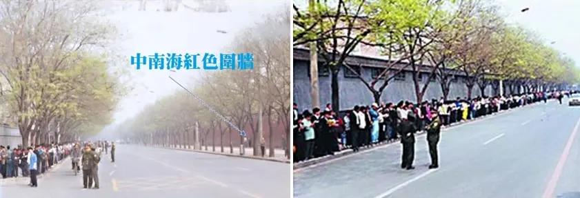 右圖:上訪的法輪功學員沒有站在中南海圍牆的一側,而是隔着府右街與之隔街相望。警察守在他們的前面,還有許多警察把守在中南海西門入口處,毫無圍攻中南海的跡像。