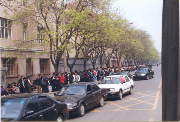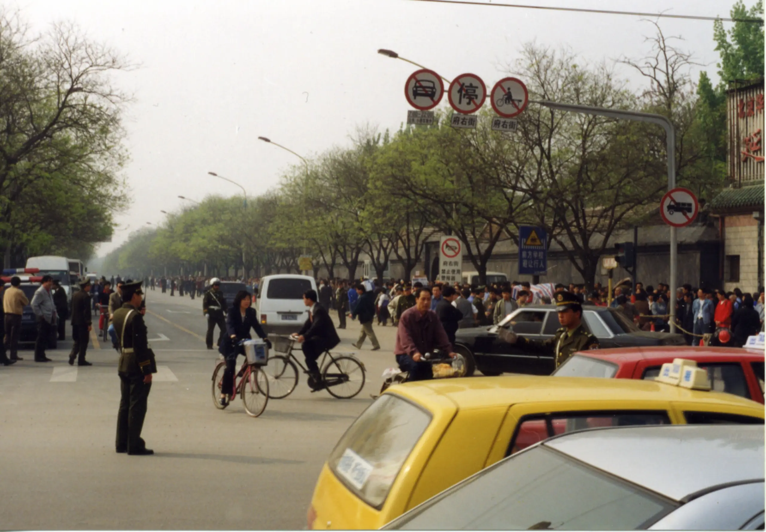 1999年4月25日,上訪的法輪功學員站在行人路上,當時自行車和小車都可自由行使。(明慧網)