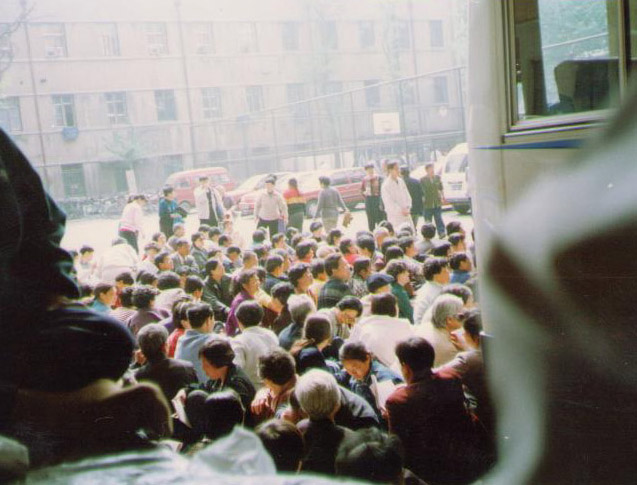 1999年4月天津法輪功學員到天津教育學院及其它機關反映法輪功實情的情景。法輪功學員安靜平和地坐在地上,有的在讀法輪功的書。(明慧網)