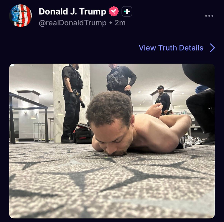 最引人關注的一步,來自·特朗普本人——他已在Truth Social發佈一張疑似嫌疑人被拘留的照片。畫面中,一名男子被執法人員壓制在地,這一畫面迅速在各大平台傳播,成為「身份鎖定」的關鍵節點。