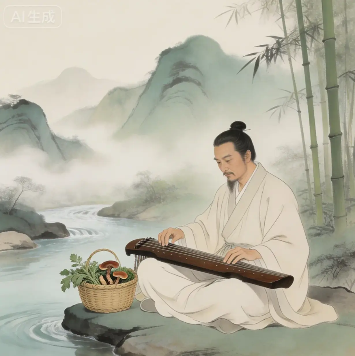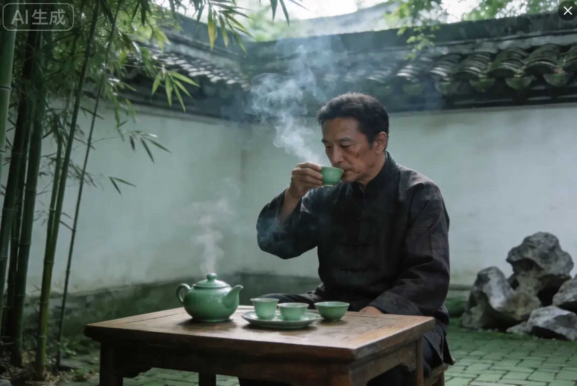 即夢 AI配圖提示詞3:中年男子靜心品茶獨坐,內心淡然無雜念,國風寫實人像,修身養心氛圍感,色調柔和沉穩,適合國學封面