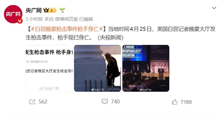 4月26日,「白宮晚宴槍擊事件槍手身亡」的詞條,衝上微博熱搜第一,內容是中共央視新聞報導的一句話新聞,稱「當地時間4月25日,美國白宮記者晚宴大廳發生槍擊事件,槍手現已身亡」。