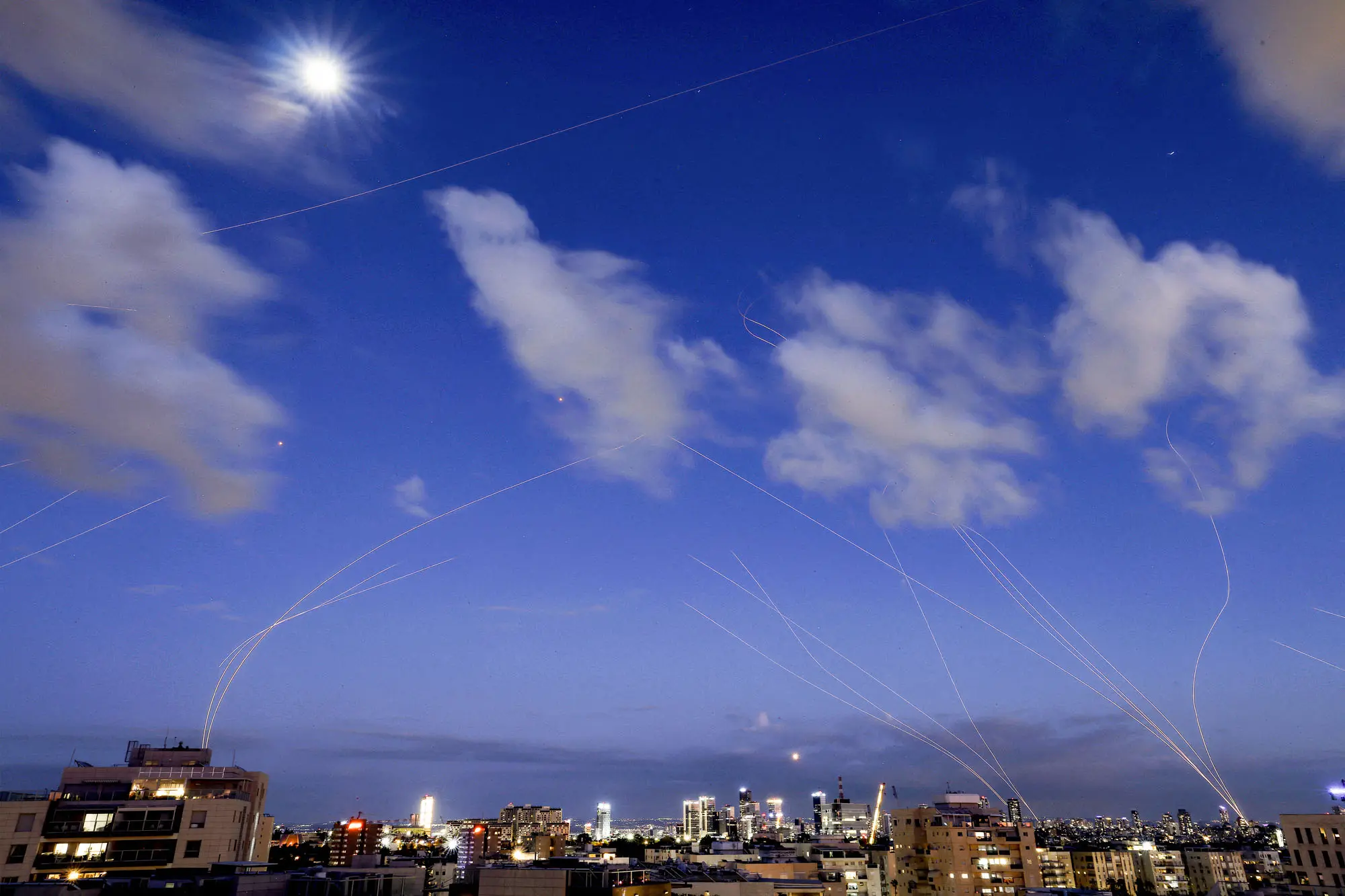 2026年2月28日,以色列「鐵穹」防禦系統在特拉維夫上空攔截伊朗導彈。(Jack Guez/AFP via Getty Images)