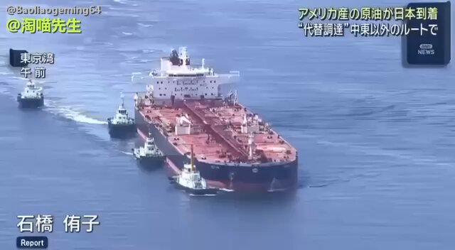 視頻畫面:大型油輪在多艘拖船護航下緩緩進港,甲板工人忙碌作業,船身清晰可見「NO SMOKING」「SAFETY FIRST」標識。日本ANN新聞明確標註:「美國產原油抵達」「這是通過中東以外『替代調達』路線的首次運抵」。