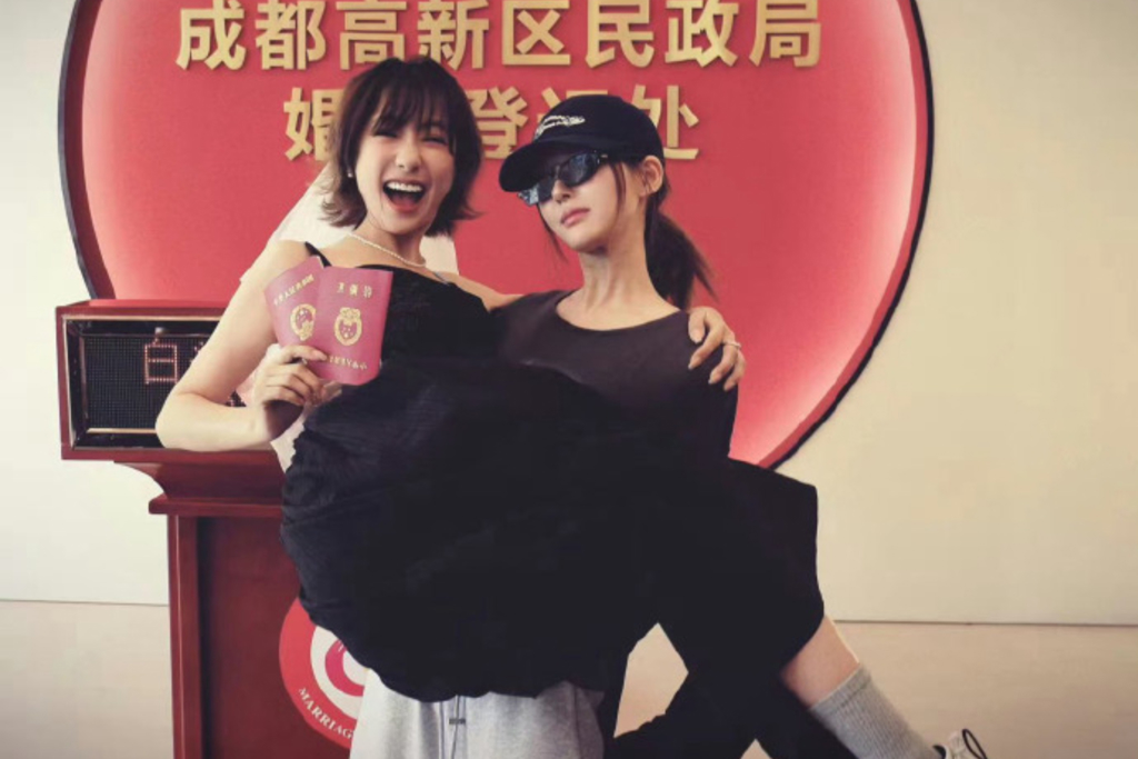 大陸女星趙露思近日現身成都民政局,引發外界一度誤會「本人領證結婚」,實際上她是陪同好友魏笑辦理結婚登記。現場照片曝光後迅速在網絡掀起討論,只見兩人站在紅色愛心背板前合影,趙露思一臉燦笑,還搞怪扮鬼臉,甚至上演「新娘抱」橋段,氣氛輕鬆又歡樂,展現兩人深厚情誼。