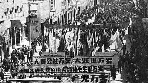 中共發動大躍進,大辦「人民公社」,遊行宣傳。(圖片來源:維基百科)