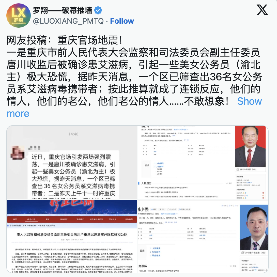 近日網絡再度傳出敏感消息:唐川入獄後被診斷患有愛滋病。隨後,關於疫情擴散的說法迅速流傳。長期關注中國社會問題的博主「羅翔——破幕推牆」於2026年4月21日發文稱,唐川確診後引發恐慌,「據昨天消息,一個區已篩查出36名女公務員系愛滋病毒攜帶者」,並警告可能出現「連鎖反應」,涉及其關係人群進一步擴散。