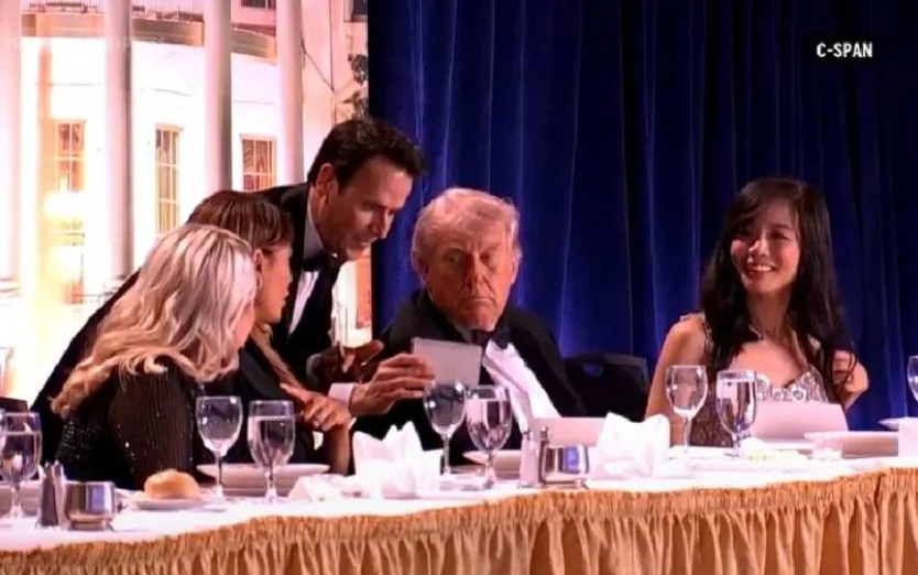 白宮特勤人員在晚宴中拿出一張紙條秀給川普看,川普隨即緊急撤離,白宮記者協會主席姜偉嘉(右)晚宴中就坐在川普身旁。圖:截圖自 C-Span畫面