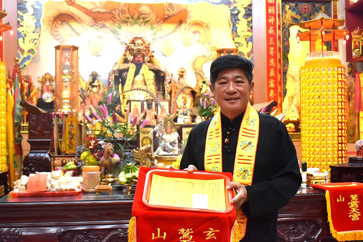 高雄市鳥松區玄鷲山高邑雲天宮主持曾俊豐,手捧關聖帝君抽出的丙午年「國運簽」。圖:孫家銘攝(資料照)