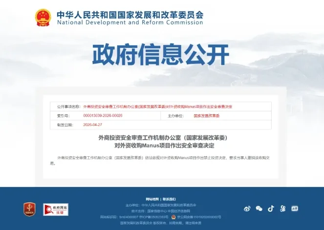 外商投資安全審查工作機制辦公室(國家發展改革委)依法依規對外資收購 Manus專案作出禁止投資決定,要求當事人撤銷該收購交易。