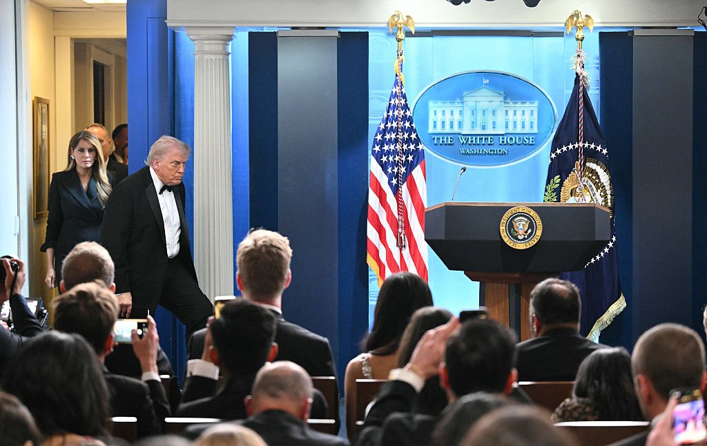2026年4月25日晚10點,美國總統川普攜第一夫人梅拉尼婭抵達位於華盛頓特區的白宮布雷迪新聞發佈廳,準備就剛發生的白宮記者晚宴槍擊事件發言。
