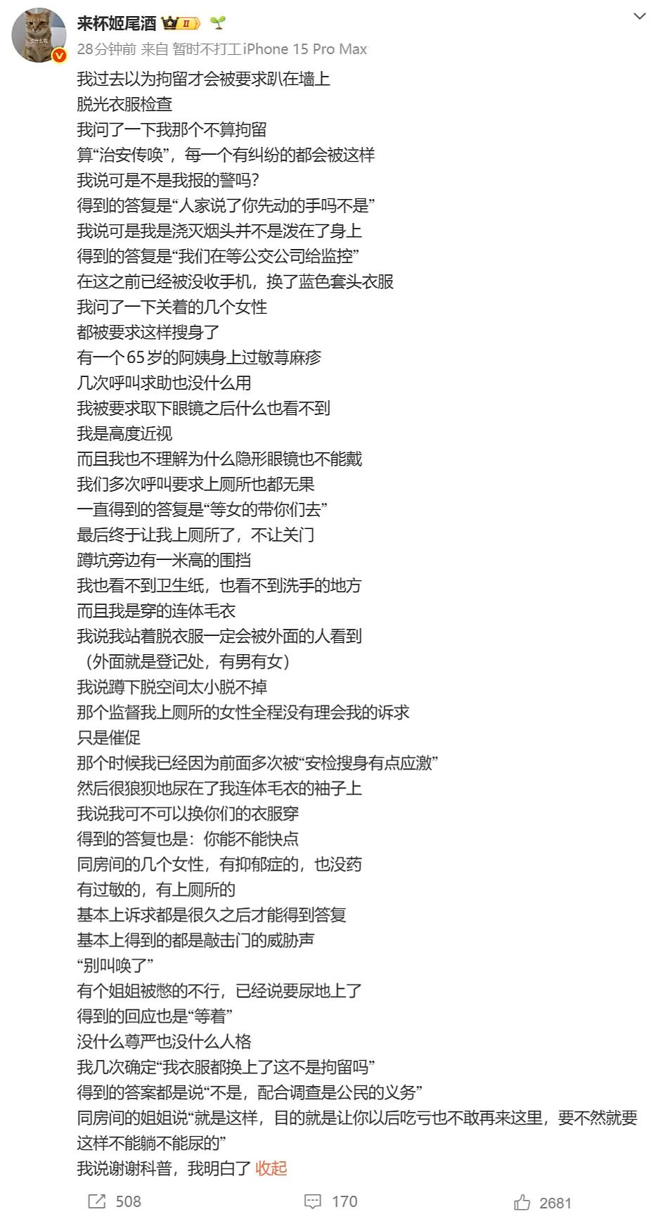 有網友指出,此事的核心問題在於警方的執法本身。深圳新一輪控煙條例已於事發前公佈,但到場警員卻未能明確判斷現場吸煙行為是否違法,隨後又回到將雙方一併帶走、推動「和解」的處理路徑。而王某某作為報案人,在缺乏正當理由的情況下被實施裸檢,既無必要,也缺乏法律依據,甚至觸及基本人權邊界。圍繞此事,不少網民提出質疑——為什麼中國警察在該公正執法時像空氣,在證明自己有權力時卻像一座山呢?也有更為直白的聲音表示,「人在中國只要報過一次警,就會對警察無限失望」、「警察水平太次法制環境太差權力太大」、「事實就是煙草還是太賺了」…..截止目前,選擇在網絡曝光此事的王某某(@來杯姬尾酒)已因「發佈的社會時事/社會熱點內容因存在不良信息」被禁言三天。