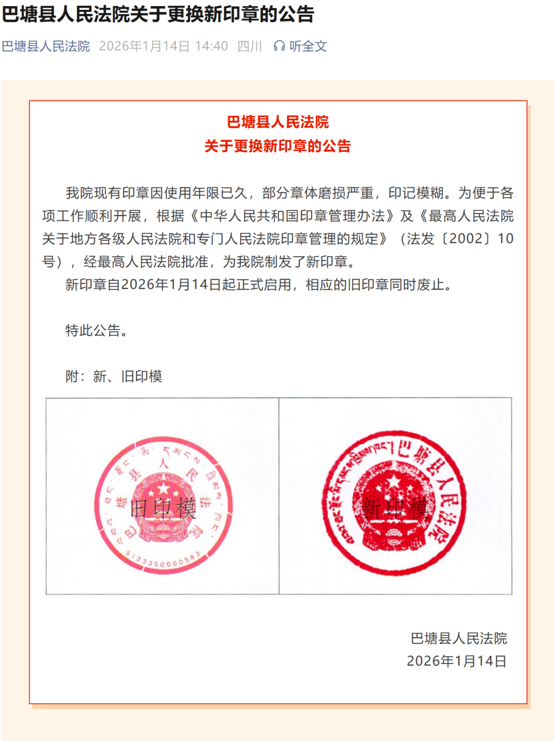 本周,多家媒體報道稱,全國30餘家法院、檢察院多年來在印章啟用或更換公告中,反覆援引一部根本不存在的「法」——《中華人民共和國印章管理辦法》。這一事件源於四川巴塘縣人民法院今年1月發佈的一份換印章公告,告援引了上述「辦法」,直至三個月後才被上級中院發現。公安部向媒體新京報確認,這部「辦法」連同網上常見的另一部《公安部印章管理辦法》均未出台、不具法律效力,所有單位的引用都是不對的,尤其是司法機關,更應當知道這是虛假的。而據新京報不完全的梳理,2019年以來,全國已有10餘個省份的30餘家檢察院、法院在印章公告中援引過這兩部「空氣法」,最早一份可追溯到2019年陝西某縣人民法院,截至報道發佈前仍有數十家司法機關保留着錯誤援引。