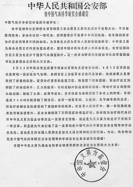 中華見義勇為基金會在1993年8月31日發出了《中華人民共和國公安部致中國氣功科學研究會感謝信》。(明慧網)