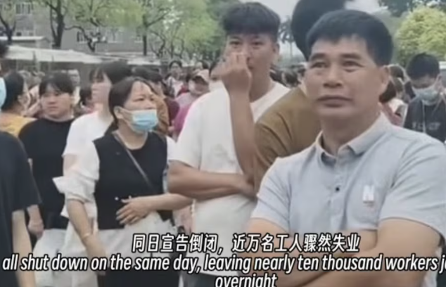 廣西玉林市多家港資玩具工廠4月20日宣佈停業,涉及近萬名工人失業。隨後約5000人連續多日在廠區外集會,要求企業結清工資並依法賠償。截至4月22日,當地政府已介入協調,但未公佈具體解決方案。