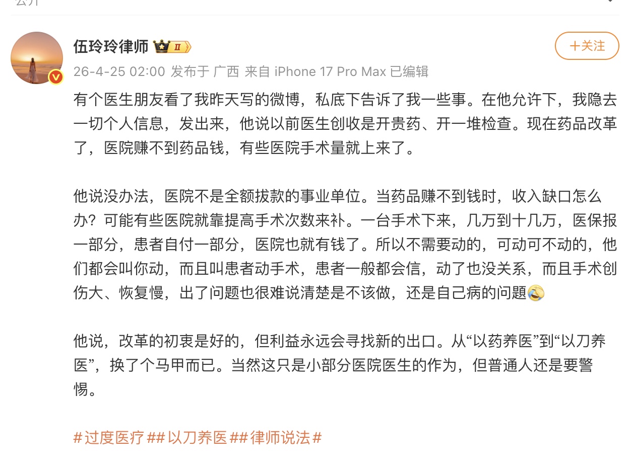 4月25日,微博網友「武玲玲律師」發帖稱,有個醫生朋友私下告訴她,以前醫生創收是開貴藥、開一堆檢查,後來藥品改革,醫院賺不到藥品錢,有些醫院的手術量就上來了。從「以藥養醫」到「以刀養醫」,換了個馬甲而已。