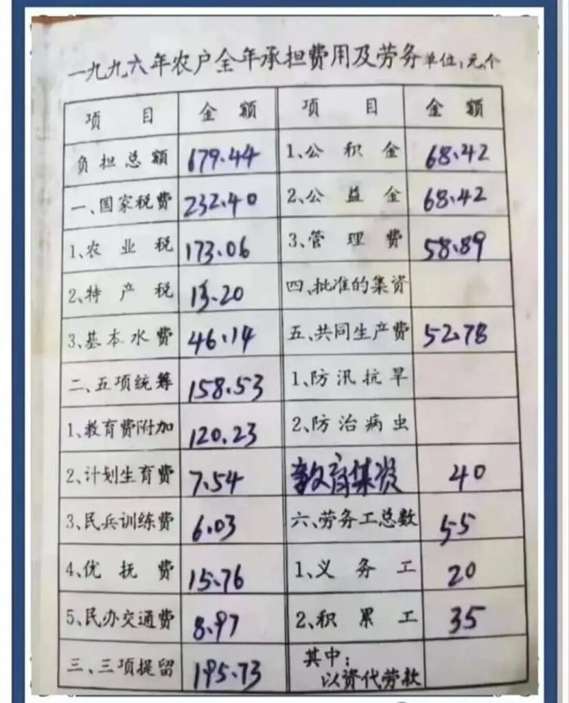 你會知道改開以後的「三提五統」,你會了解到「出義工」及「教育集資」。「三提」是指用於村集體生產及水利建設的公積金、用於貧困戶供養的公益金和村幹部報酬及辦公開支管理費。「五統」指的是鄉村兩級辦學、計劃生育、軍烈屬優撫、民兵訓練和鄉村道路建設。「三提」和「五統」這幾項所需的費用均向農戶直接攤派收取。「出義工」是說,植樹造林工程、水利基礎設施及公共道路修建,都是靠農民在農閒時「出義工」的無償勞動換來的。直到2006年農業稅的廢除,這些才退出了歷史舞台。