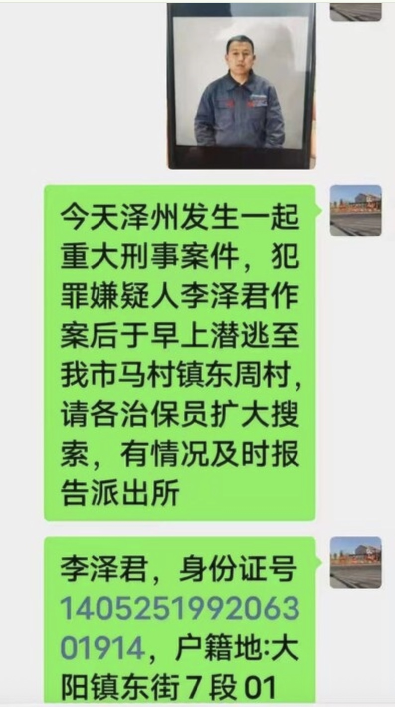 該知情人提供的截圖顯示,嫌犯名叫李澤君,作案後早上潛逃至馬村鎮東周村,戶籍地為大陽鎮東街。