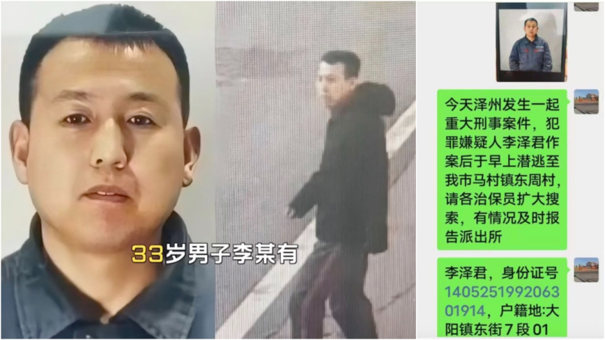 2026年4月26日,山西澤州縣發生一起重大刑事案件,當地警方發佈通告懸賞5萬元通緝嫌犯。(網絡截圖)