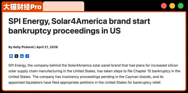 最近,SPI Energy在開曼群島的清算還沒結束,就在美國也開始了破產程序,接下來會是聽證程序,但是破產基本沒跑了。