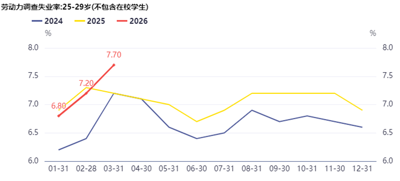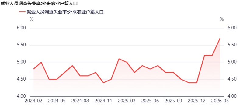 2023年底統計J優化了數據統計口徑,各個年齡段均剔除了在校學生(理論上降低失業率),但即便如此,統計J亦護不住。我把2024年以來的季節性圖表拉了下,16-24歲,25-29歲和30-59歲3月失業率均在近3年同期的最高水平,分別為16.9%,7.7%和4.3%。從惡化程度看,跳升顯著的是16-24歲和25-29歲組,3月環比2月提升了0.8個和0.5個百分點。連外來農業戶籍人口即農民工失業率3月升至5.7%,亦創出新高。過去寫失業率惡化僅限於16-24歲青年人,目前看各個年齡段都在惡化。