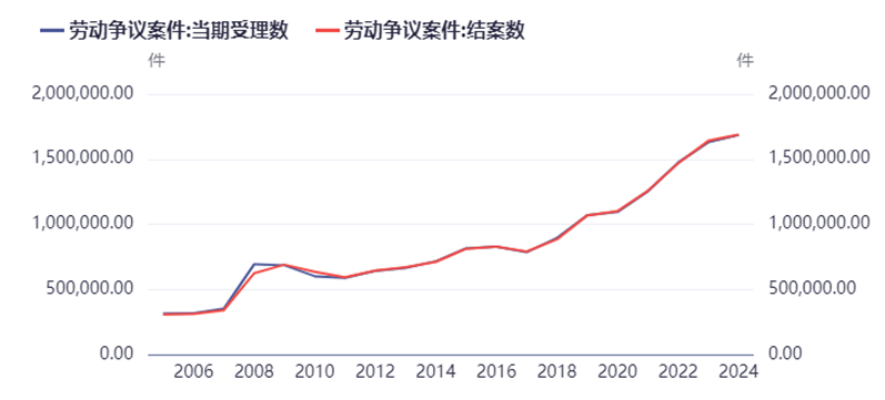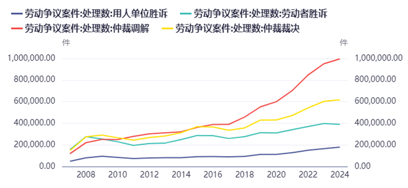 另外有個有意思的數據,勞動爭議案件的每年受理數和結案數,統計數據僅到2024年。我們看到2020年之後,案件數量上升的斜率大幅提高。從細分項看,仲裁調解,仲裁解決的案件佔了大多數,其次是勞動者勝訴,最後是用人單位勝訴。