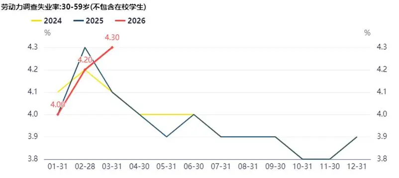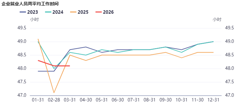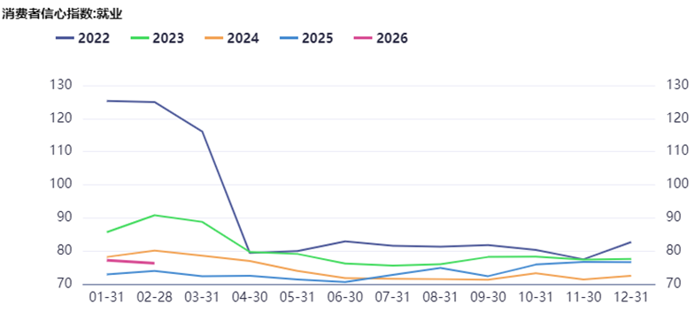 對於失業率與就業數據,不能評判太多。目前關於就業的消費者信心指數還在歷史低位,但2026年相比2025年已有所改善。此外,值得欣慰的一個數據是,企業就業人員的周平均工作小時終於下降到近4年的最低位,看來反內卷有點效果?