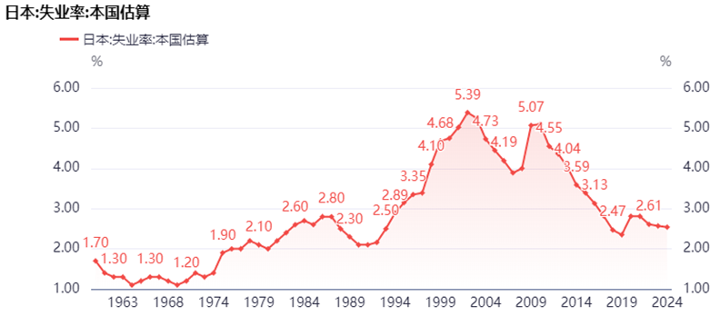 最後,貼一張日本1960年以來的失業率走勢圖。1990年之前是經濟上行期的美,失業率一直在3%下方;1990年泡沫破滅後,失業率從2.5%的中樞上升到4-5%的中樞水平,直到2013年安倍經濟學之後日本失業率才大幅回落。