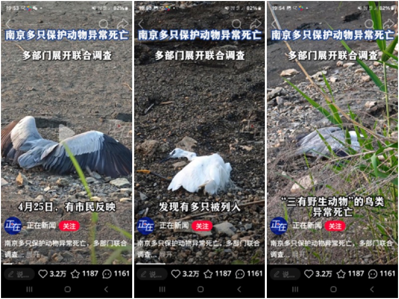 據青島廣播電視台《正在新聞》官方賬號27日披露,4月26日南京市民發現在當地的永寧街道、青山漁村附近的魚塘,發現有多隻被列為「三有野生動物」的鳥類異常死亡。