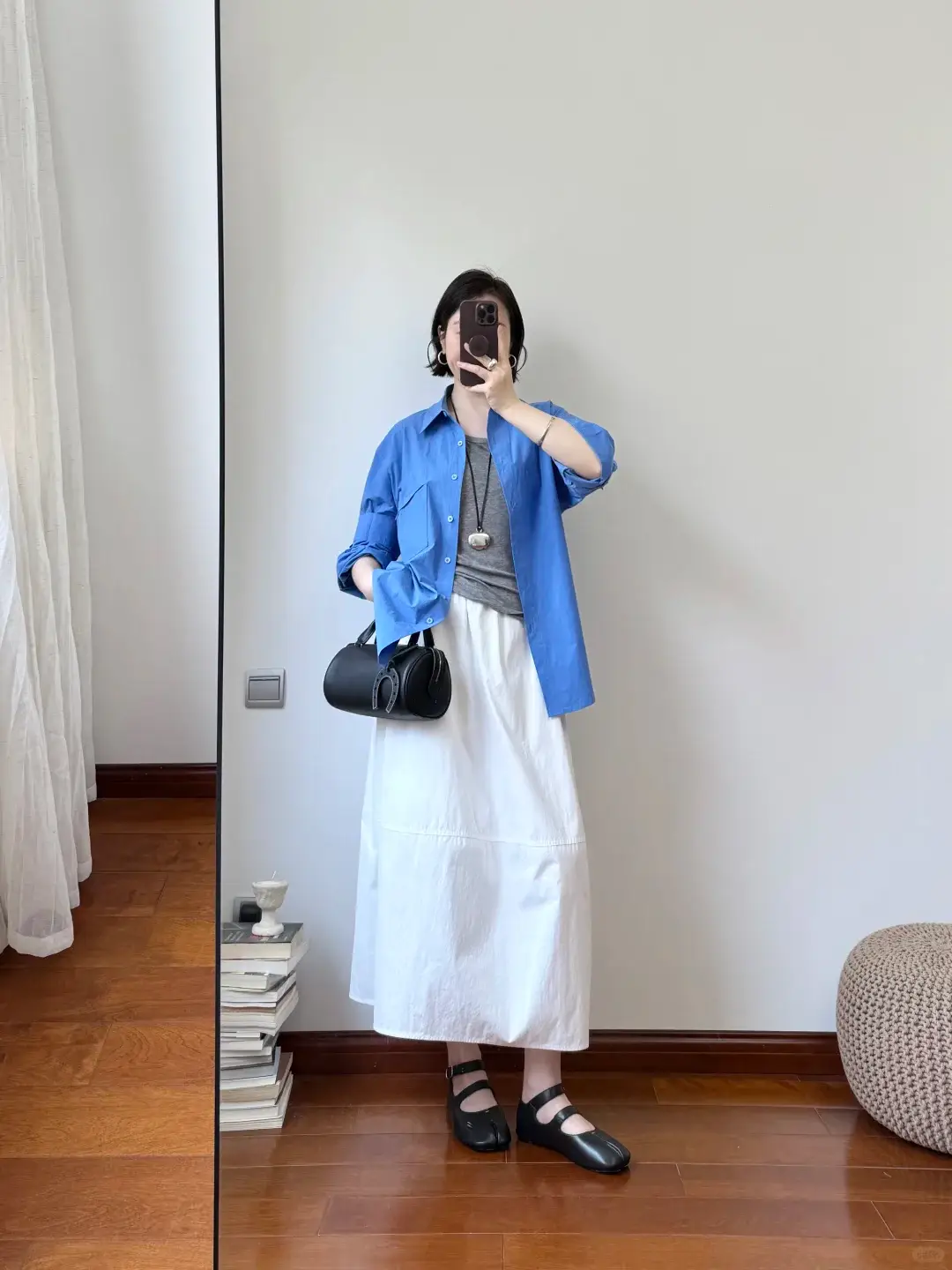 藍白搭配是初夏自帶的清爽密碼,溫柔又耐看。寬鬆藍色襯衫隨性慵懶,搭配簡約白色半身裙,乾淨又顯氣質。內搭一件灰色 T恤做打底,層次瞬間拉滿,弱化單調感。