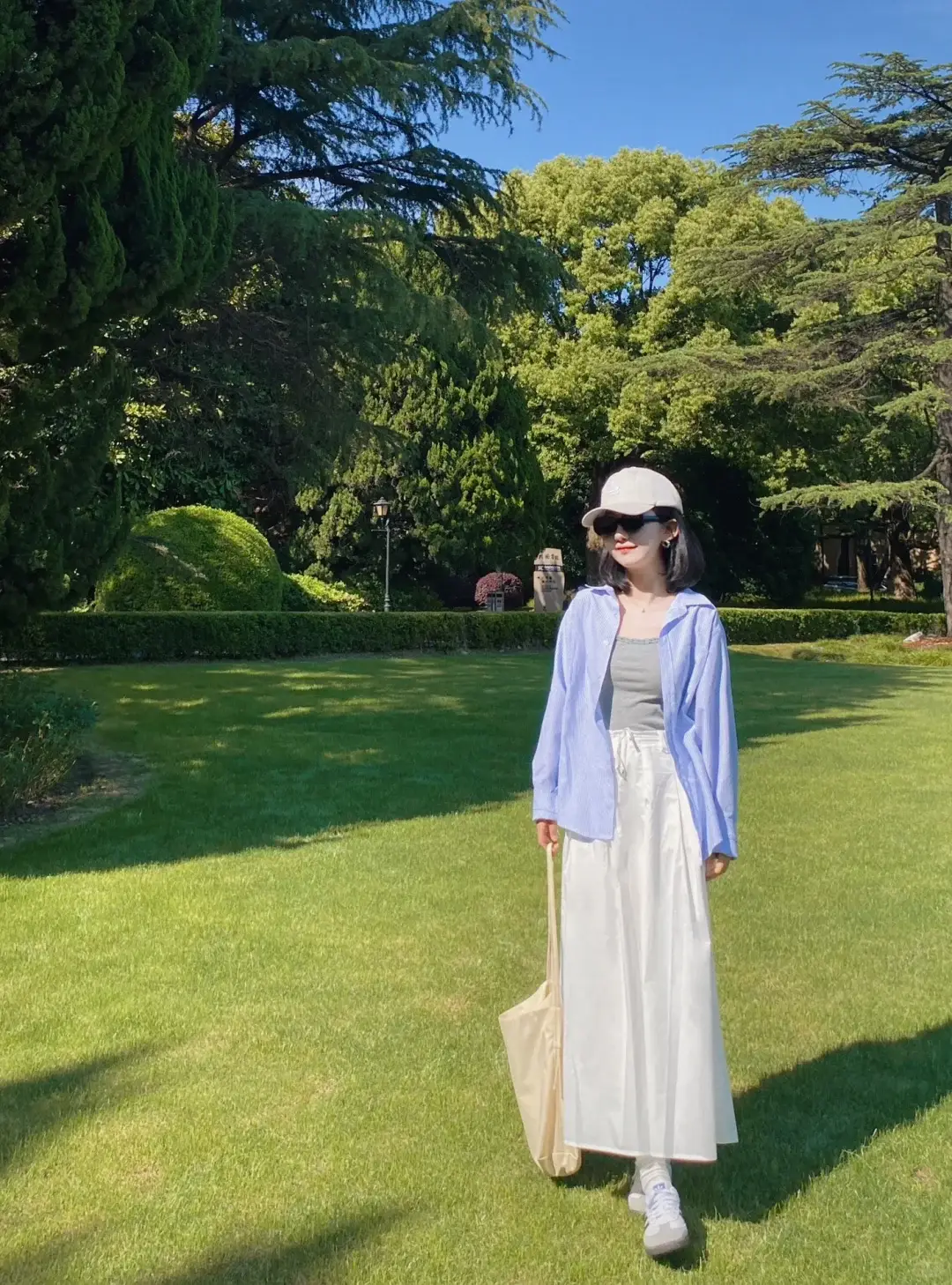淺藍襯衫溫柔清爽,內搭灰色小吊帶簡約又顯瘦,恰到好處增加穿搭層次感。下身搭配白色高腰半身裙,拉高腰線優化比例,盡顯溫柔身段。再配上簡約白色平底運動鞋,弱化穿搭的正式感,溫柔又鬆弛。整套淺色系組合乾淨治癒,清爽耐看,輕鬆適配日常出行與短途漫步。