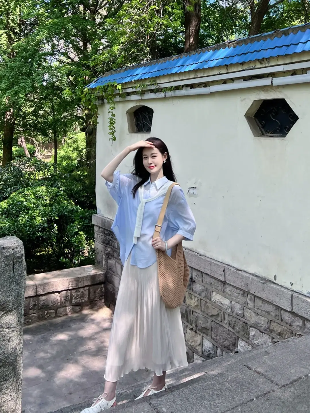 襯衫還可以單穿,寬鬆版型的淺藍中袖襯衫單穿更顯隨性自在,利落又藏肉顯瘦。搭配清爽白色百褶半身裙,靈動溫柔,自帶少女氛圍感。簡約白色運動鞋弱化甜膩感,增添休閒鬆弛氣息。整套淺色系組合乾淨治癒,清爽不悶熱,日常出行、逛街通勤都很合適,溫柔又耐看。