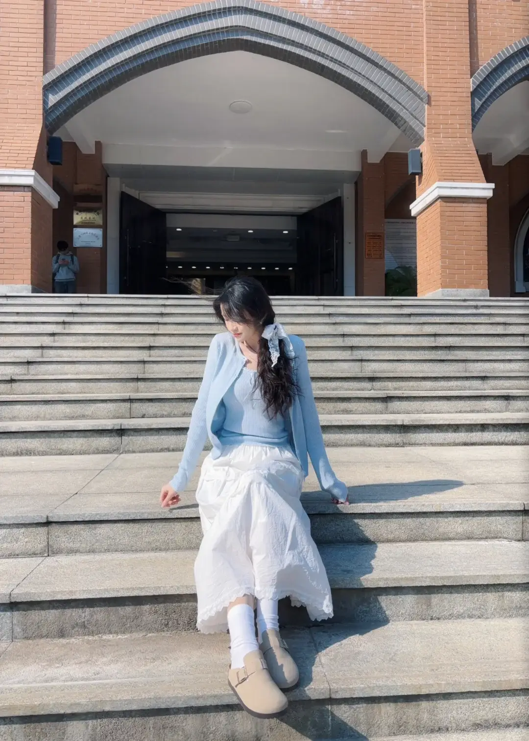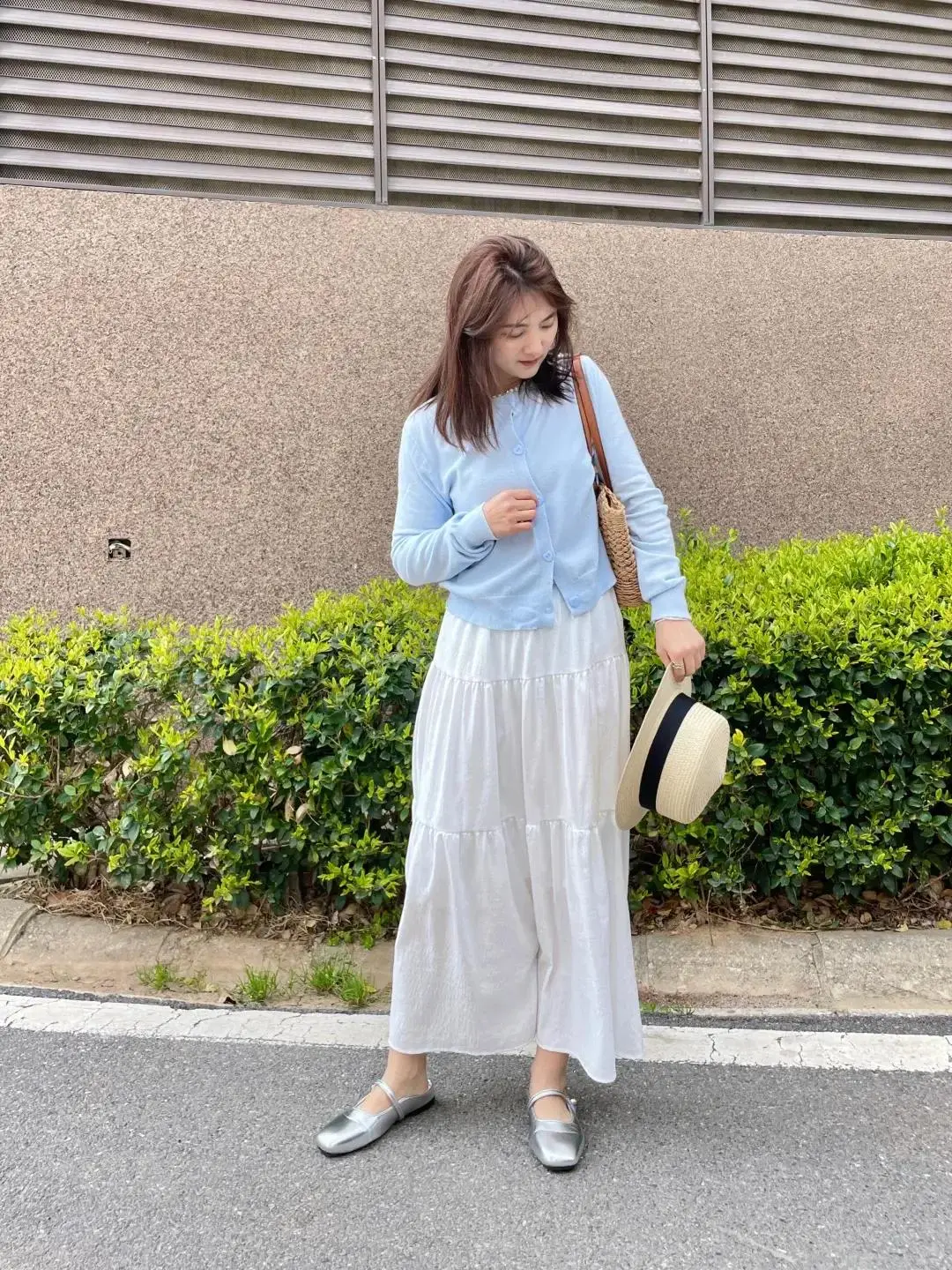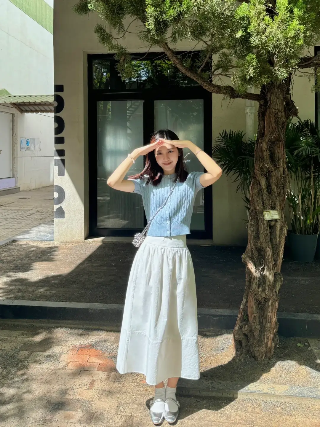 淺藍針織衫軟糯溫柔,觸感輕盈透氣,適配初夏微涼天氣。搭配乾淨的亮白色半身裙,配色清新治癒,自帶柔和氛圍感。一雙銀色瑪麗珍鞋點綴細節,精緻又不失溫婉,中和素雅感。整套穿搭簡約高級,溫柔顯貴,日常出行或是輕通勤,都盡顯優雅大方的夏日氣質。