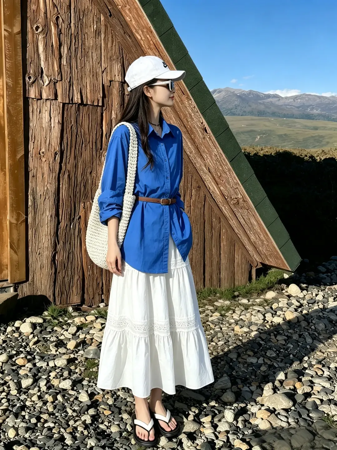 寶藍色長款襯衫自帶復古氛圍感,搭配一根棕色腰帶利落收腰,輕鬆打造優越高腰線,優化身形比例。下身簡約白色半身裙溫柔百搭,冷暖色調溫柔碰撞。再配上米白色編織包,融入自然慵懶氣息,整套穿搭清爽雅致,高級又有層次感,完美詮釋初夏優雅鬆弛穿搭。