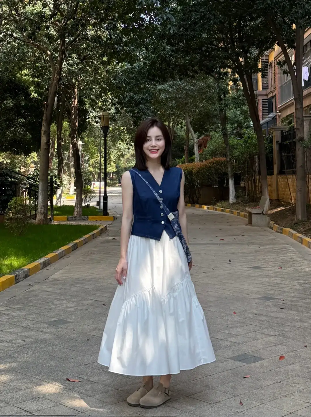 利落的深藍色小馬甲,自帶利落質感,搭配溫柔白色傘裙,藍白撞色乾淨素雅,簡約又盡顯高級格調。疊穿搭配靈活百變,可單穿打造清爽氛圍感,也能搭配輕薄小西裝,溫柔中透着幹練。整套穿搭適配多種場景,鬆弛耐看,輕鬆解鎖初夏氛圍感穿搭。