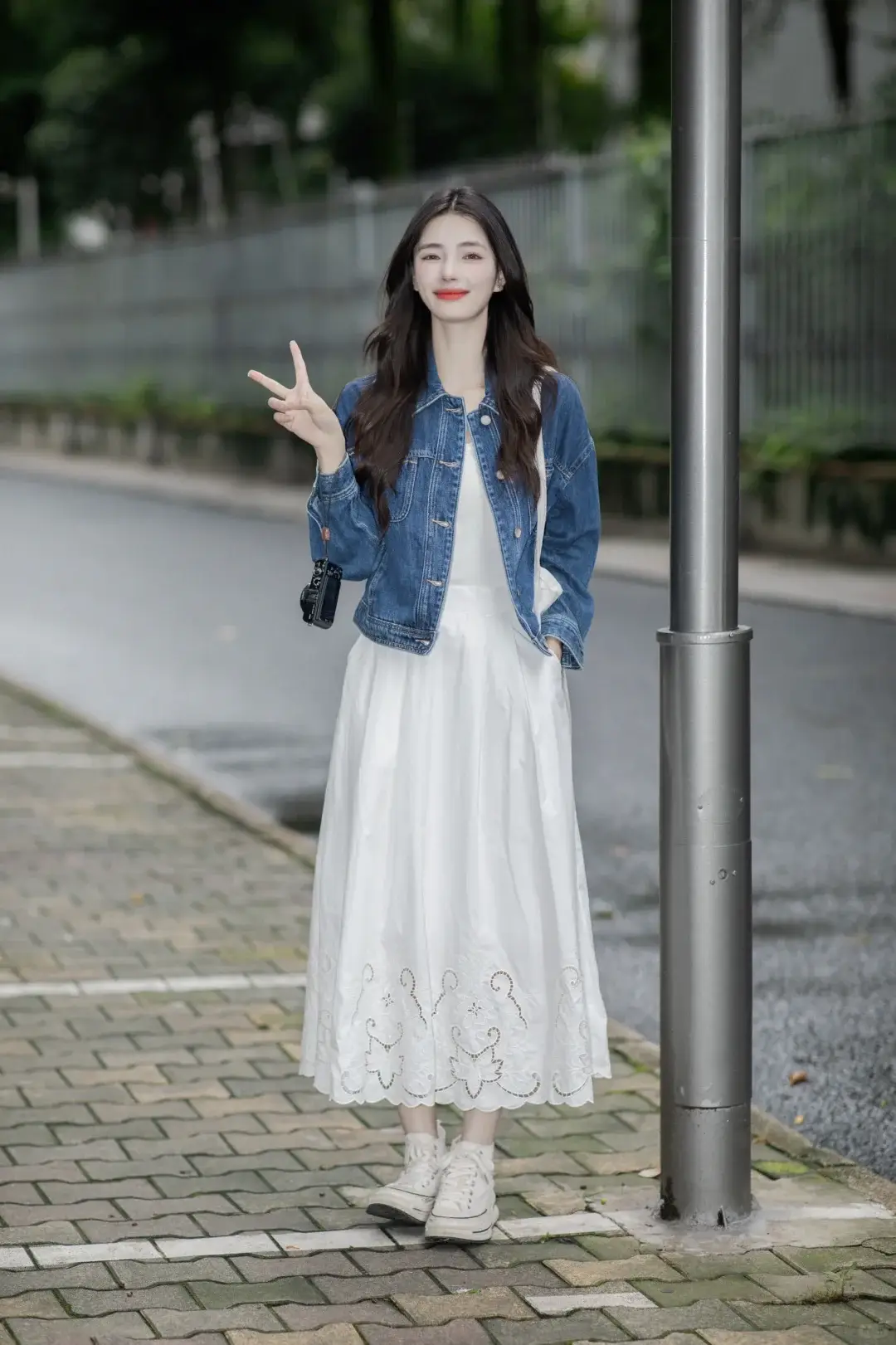 初夏早晚溫差明顯,輕薄短外套實用又百搭。清爽藍色牛仔外套利落休閒,內搭簡約白色 T恤,乾淨大方。下身配上白色高腰半身裙,拉高腰線、優化比例,氣質溫柔。再搭配同色系帆布鞋,休閒與優雅巧妙融合,整套藍白穿搭清爽耐看,日常出行舒適又顯氣質。