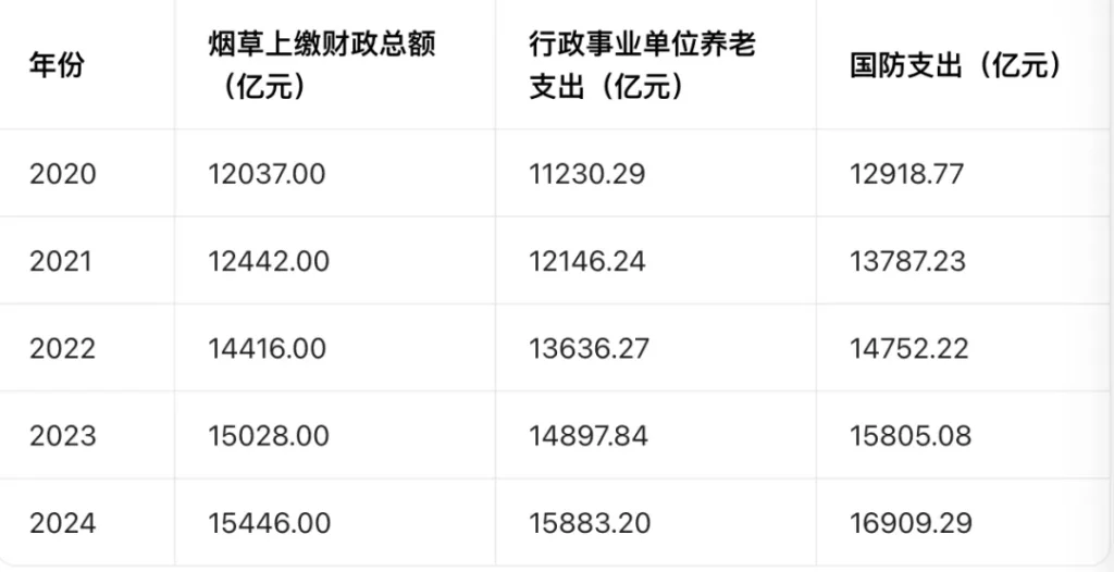 文章《煙草是世界上最糟糕的收稅方式》裏面提到2024年中國煙草上繳財政總額1.54萬億。寫完總覺得這個數字有點眼熟,今天上午突然想起,這不正好跟財政對體制內的養老補貼差不多嗎?根據財政部「2024年全國一般公共預算支出決算表」,這一年行政事業單位養老支出是15883.2億元。然後順手整理了一下從2020年到2024年,中國煙草上繳財政總額與行政事業單位養老支出、國防支出的金額: